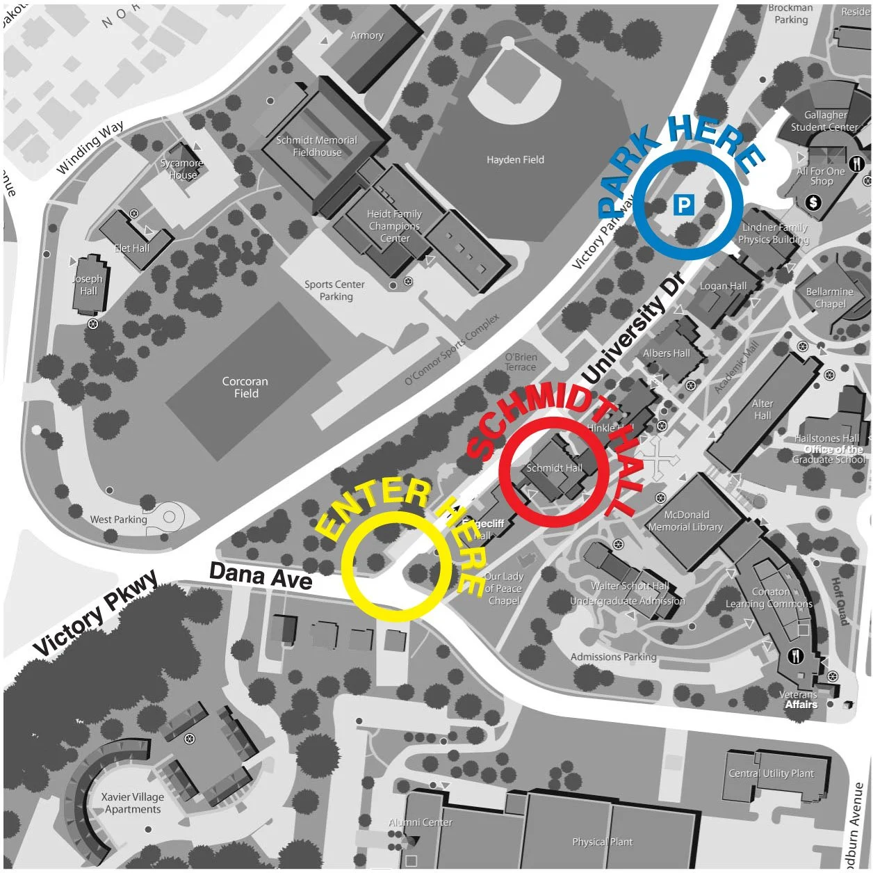 Please navigate to 5701 Delhi Ave. Cincinnati, OH 45233. Park in Neeb Garage and follow red arrow on map to Molloy Room.