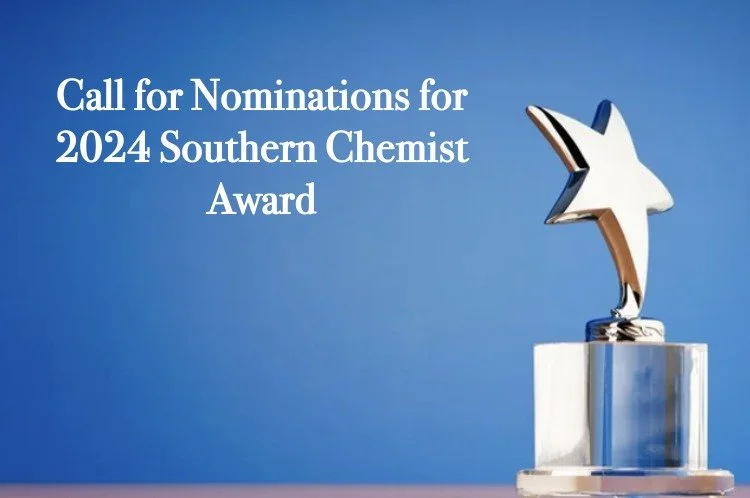 The Memphis Section of the American Chemical Society is soliciting nominations for the 2024 Southern Chemist Award. Nominees should be U.S. Citizens or permanent residents, have worked in the South at least 10 years, and have at least a 10-year record of accomplishment. In addition, nominees must have actively participated in ACS events and brought recognition to the South through their work.